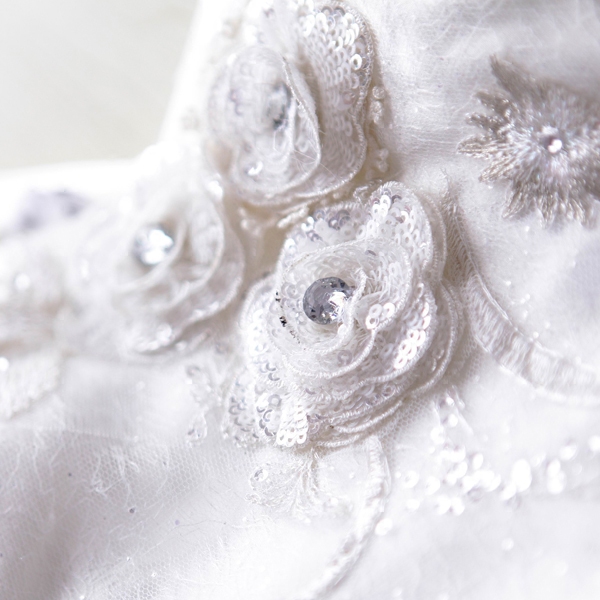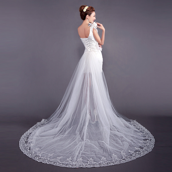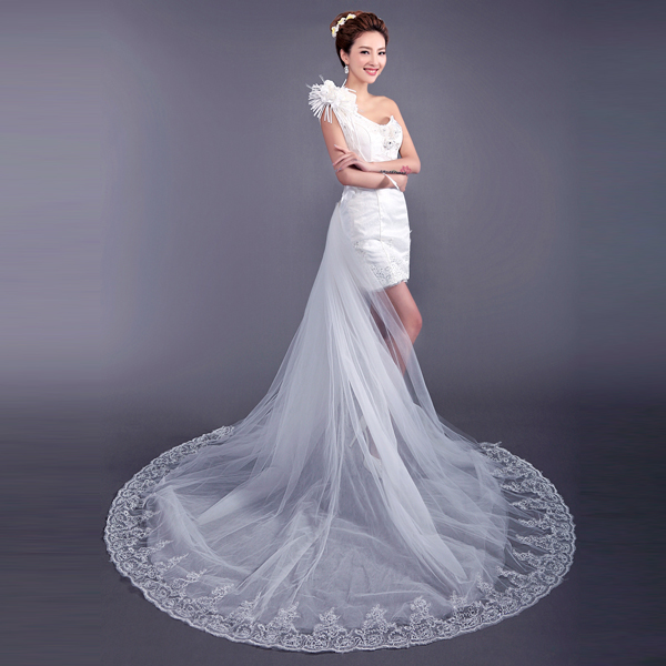 • 奢華蕾絲花朵單肩新娘前短后長(zhǎng)拖尾婚紗禮服蘇州廠家9271冬季