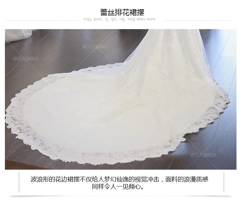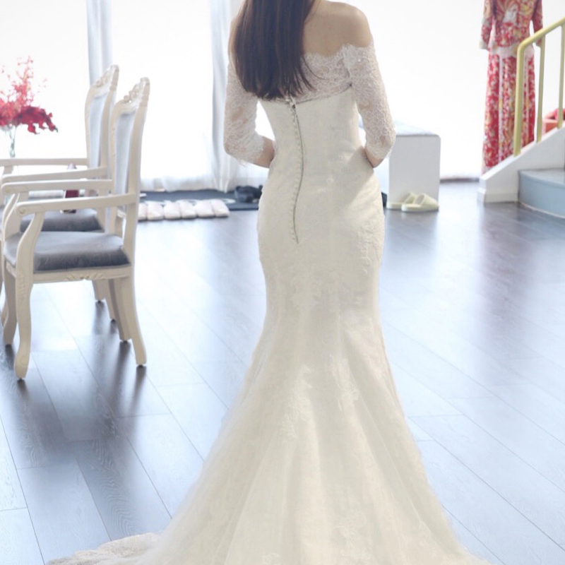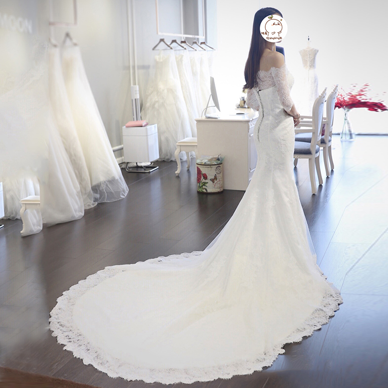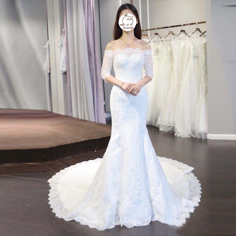 • 韓式收腰修身魚尾婚紗禮服新娘長(zhǎng)拖尾一字肩中袖結(jié)婚顯瘦