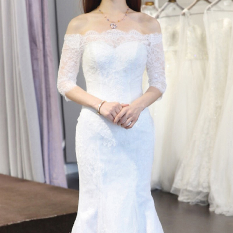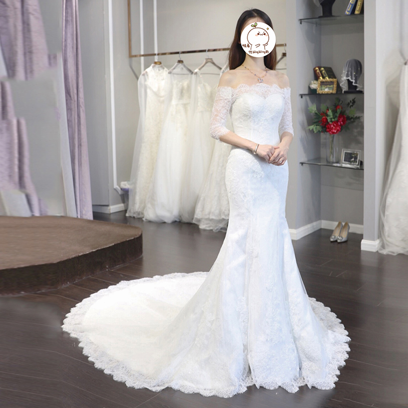 韓式收腰修身魚尾婚紗禮服新娘長(zhǎng)拖尾一字肩中袖結(jié)婚顯瘦