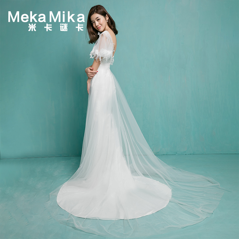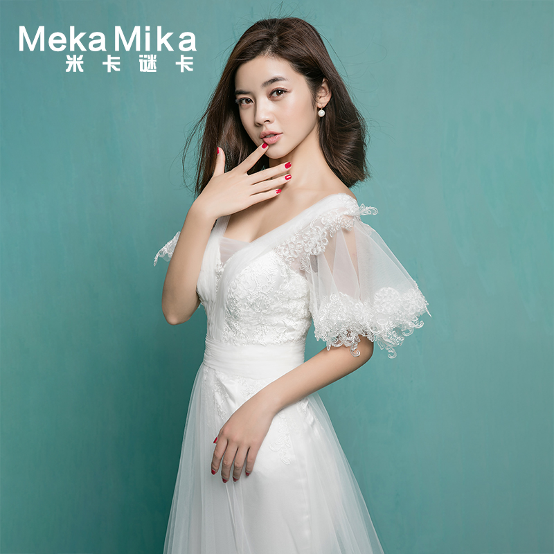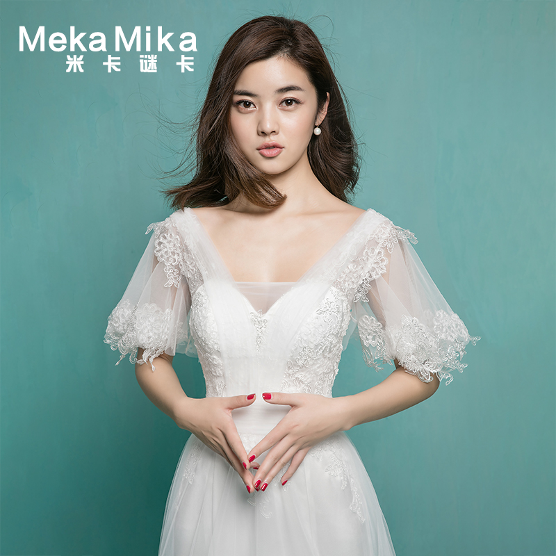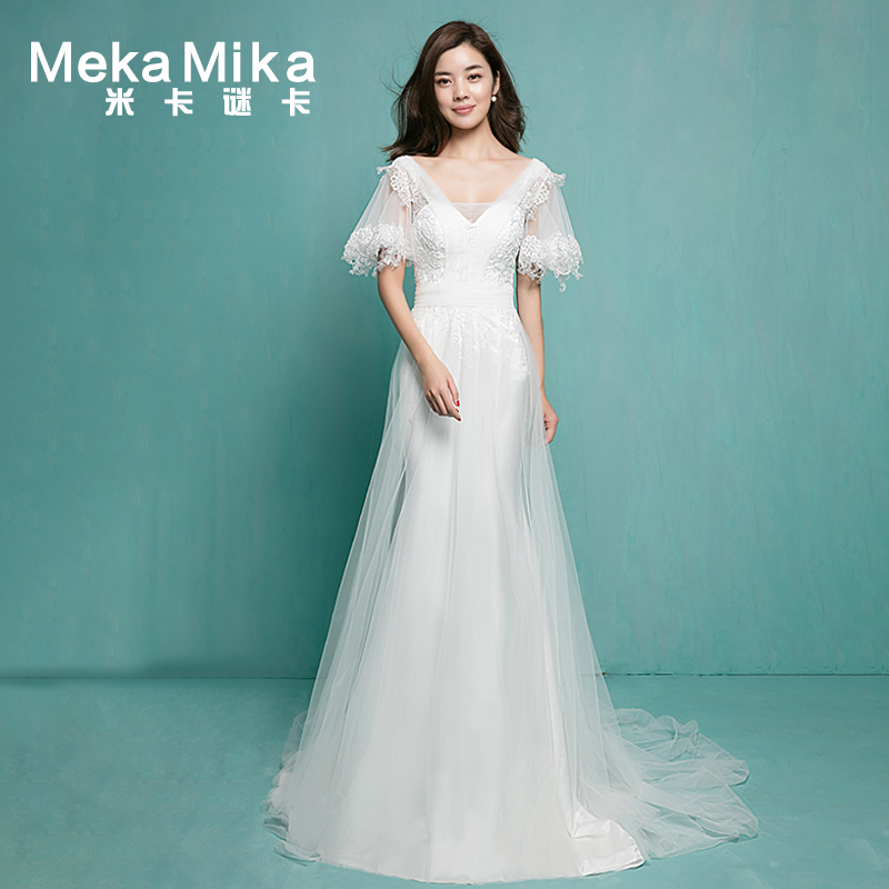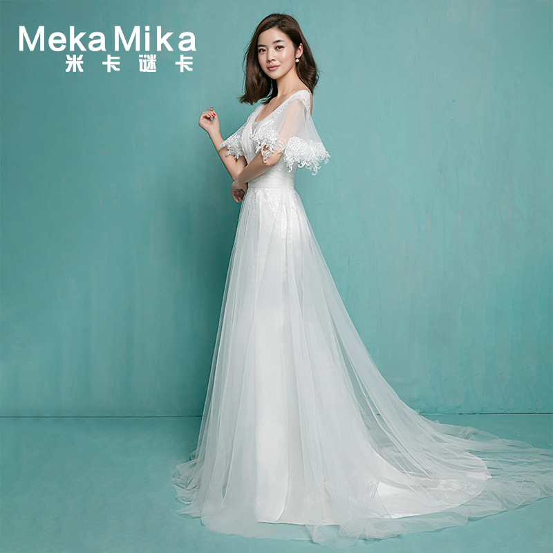 • 米卡致雅2017春季新款雙肩深V小拖尾孕婦蕾絲喇叭袖修身