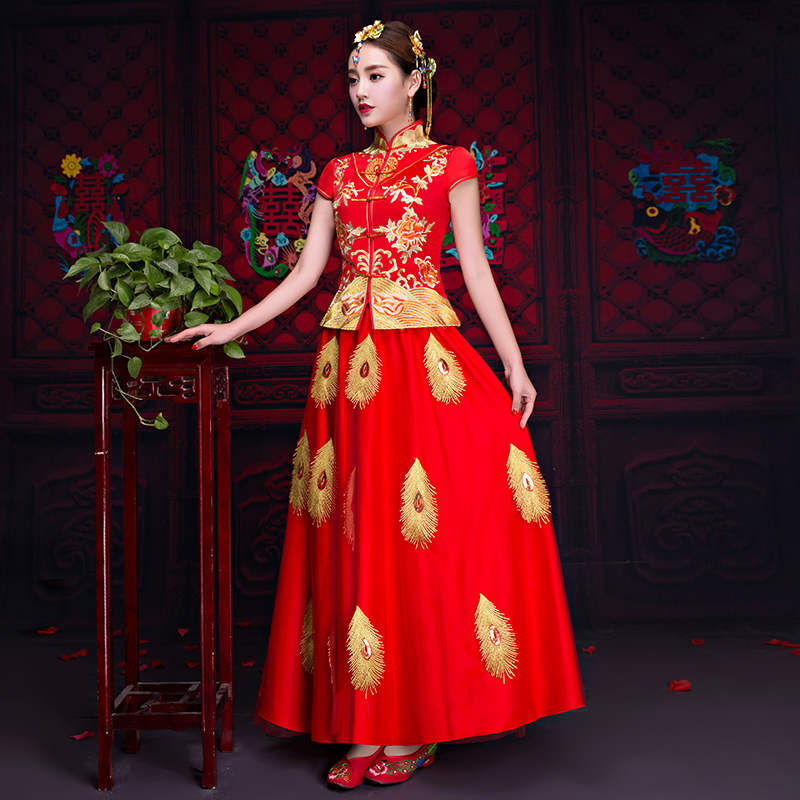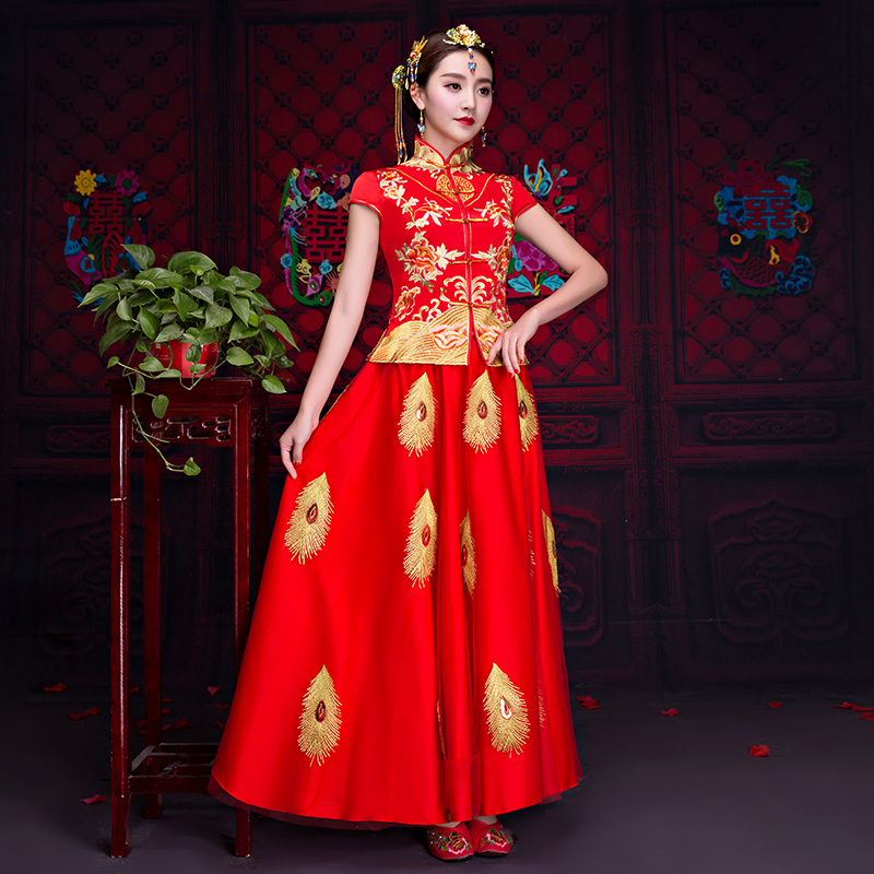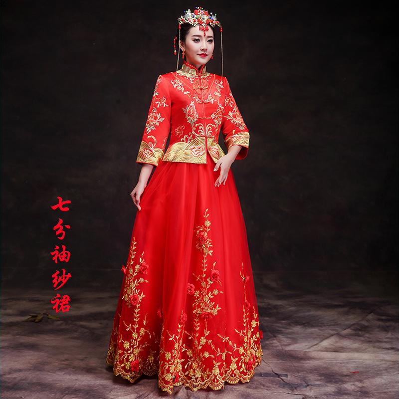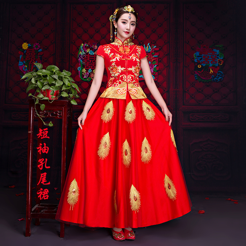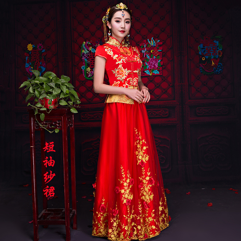 送頭飾好評返現(xiàn) 2017春夏中式婚禮新娘敬酒服短袖喜服龍鳳褂