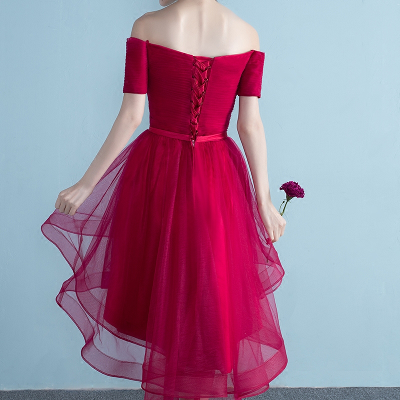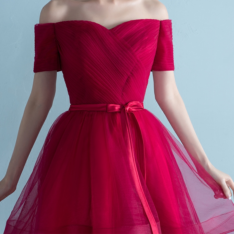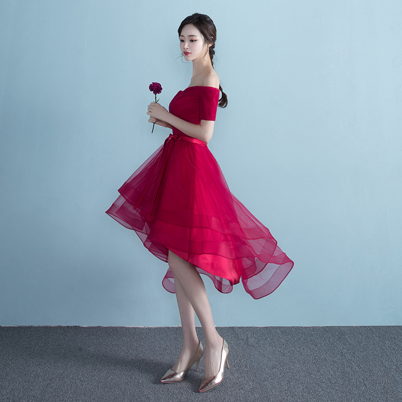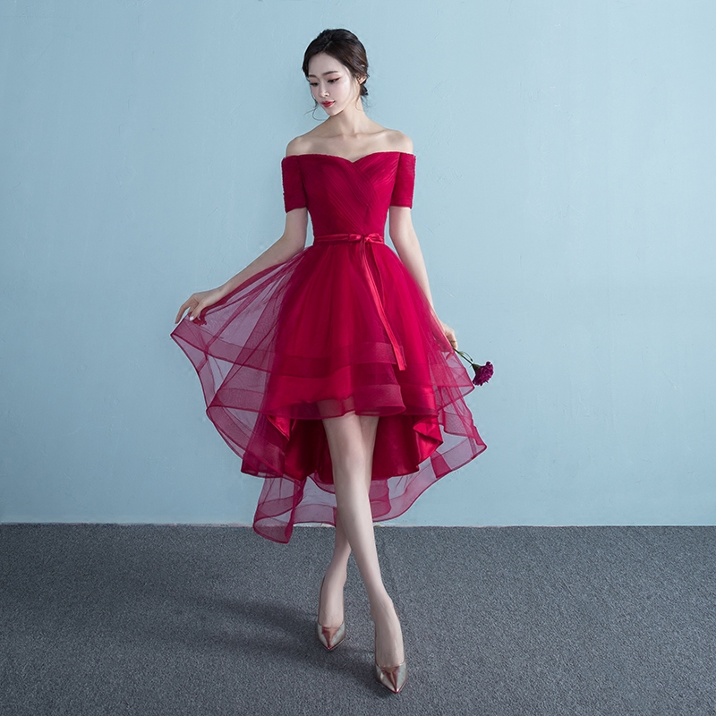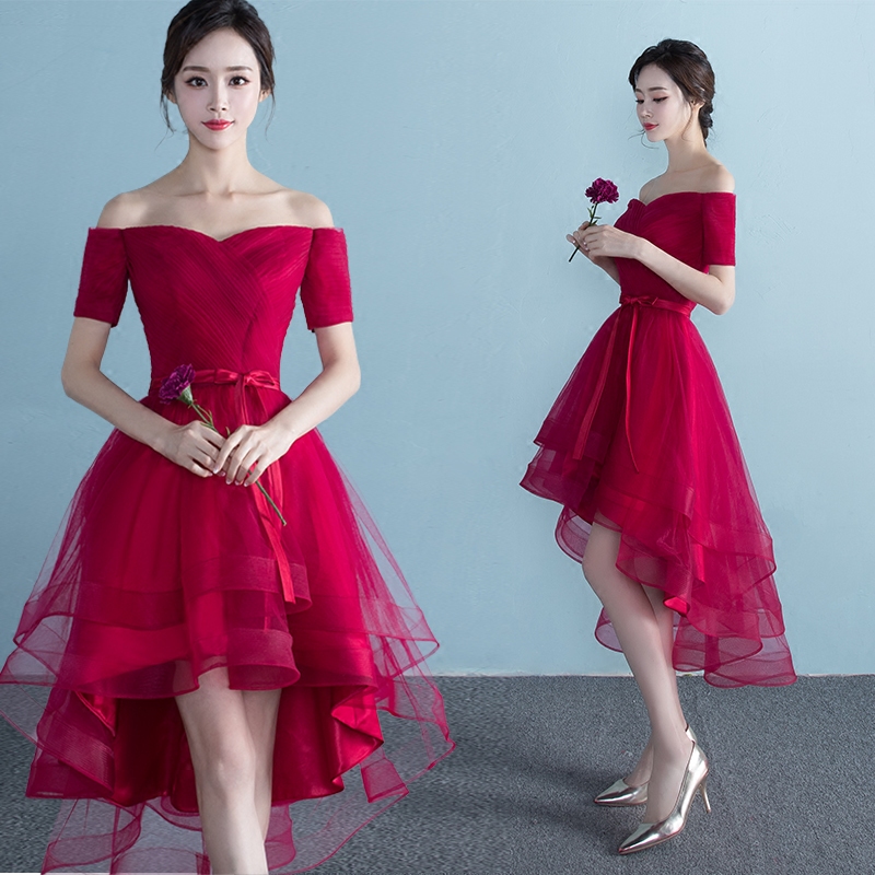 • 新娘敬酒服2017新款夏季結(jié)婚宴會一字肩禮服修身前短后長連衣