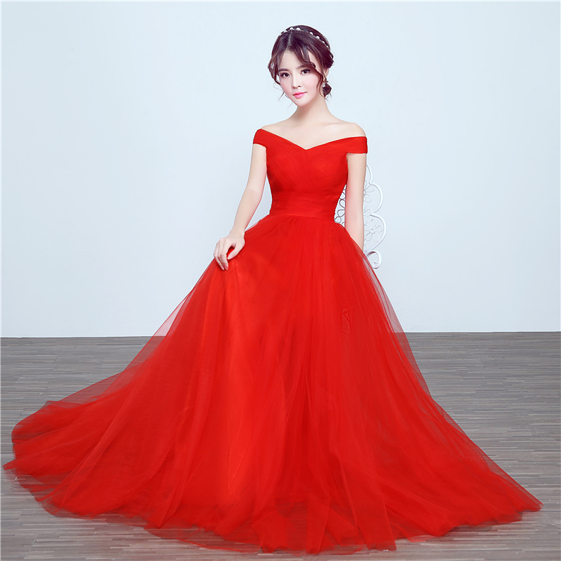 • 敬酒服2017新款春季一字肩長(zhǎng)款紅色新娘顯瘦孕婦宴會(huì)晚禮服女