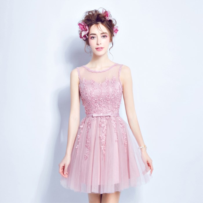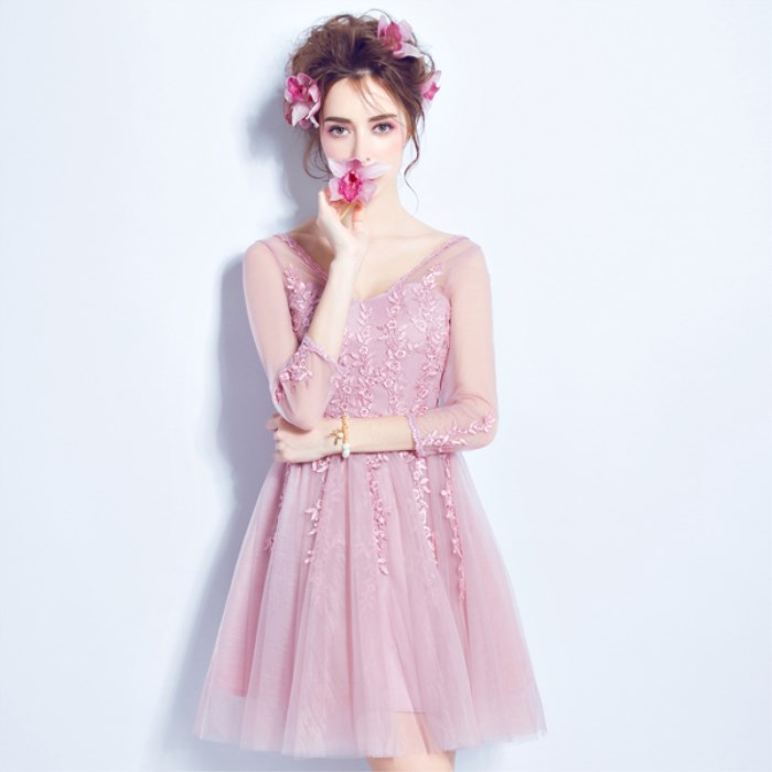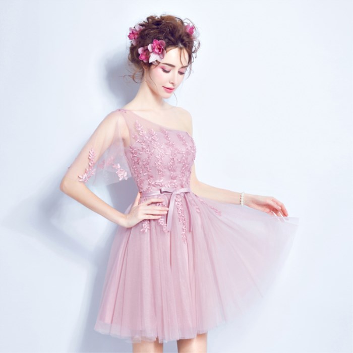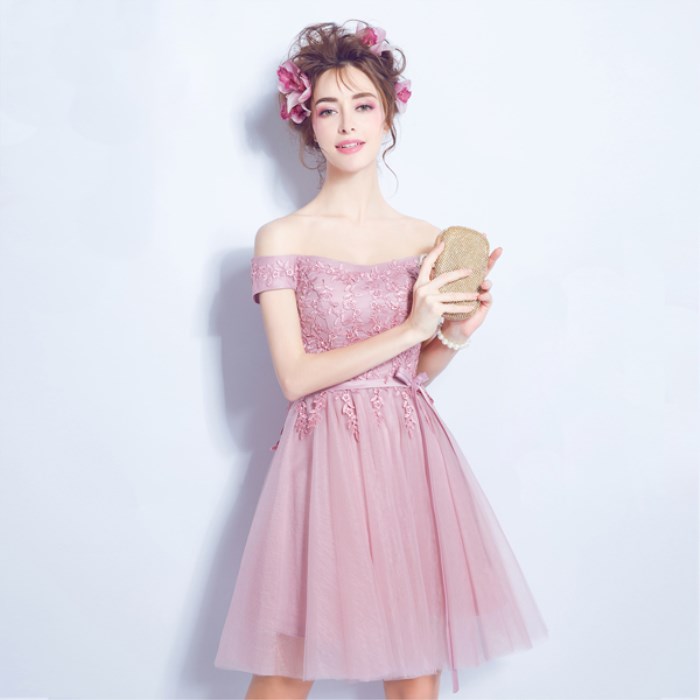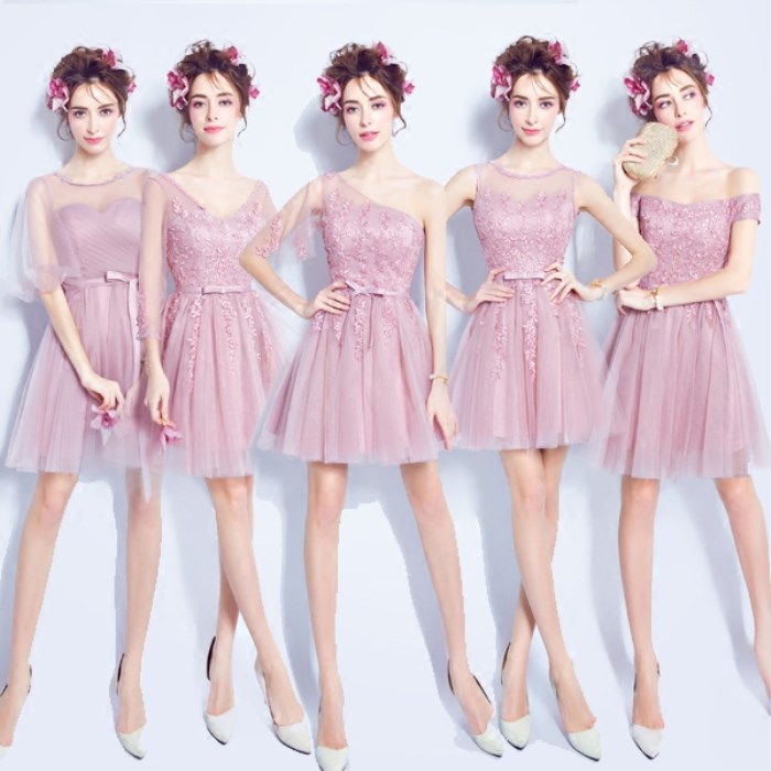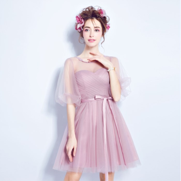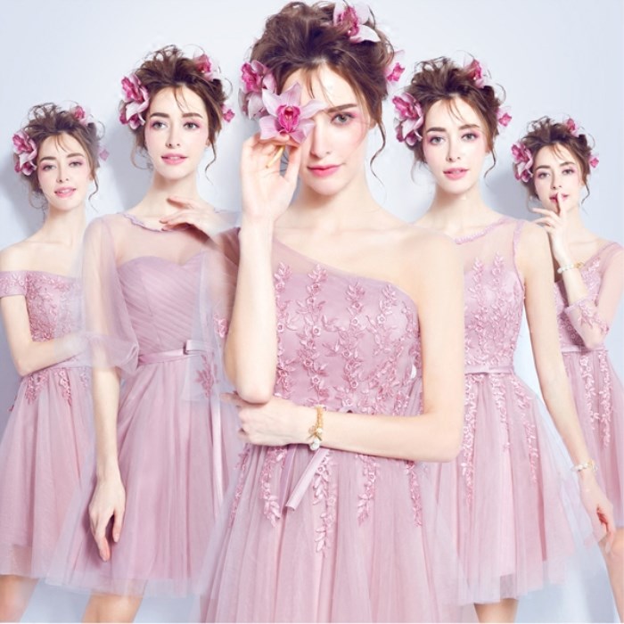 • 薔薇粉色伴娘裝伴娘團(tuán)短款抹胸單肩長袖一字肩伴娘婚紗小禮服