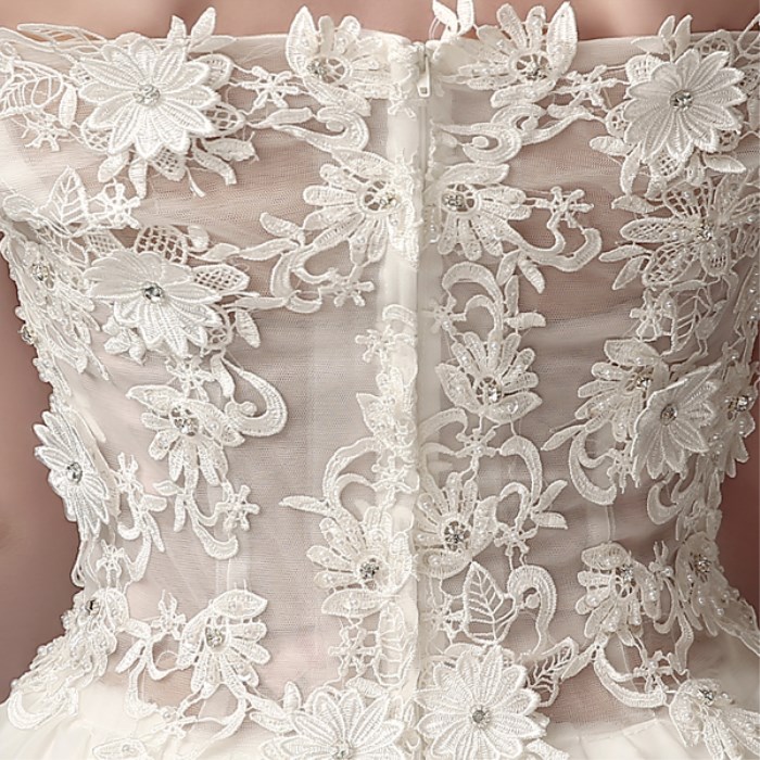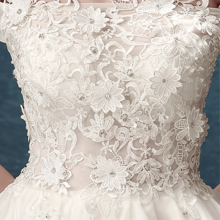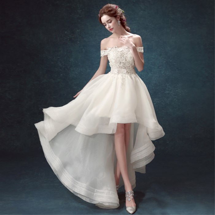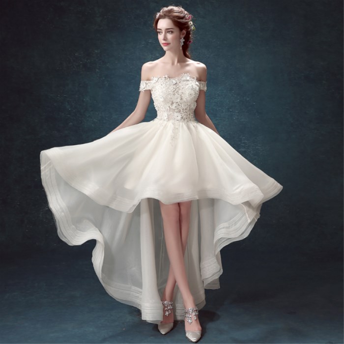• 嫁衣幻美仙氣法國蕾絲一字肩新娘前短后長拖尾婚紗禮服