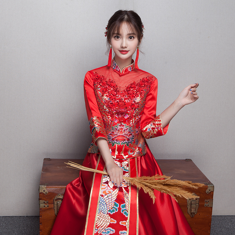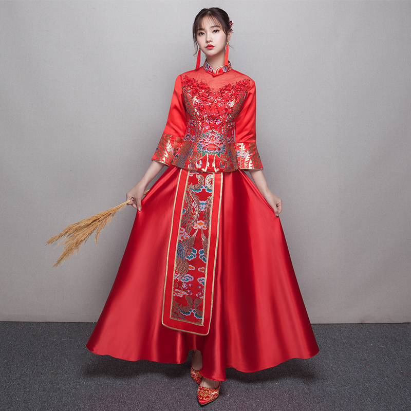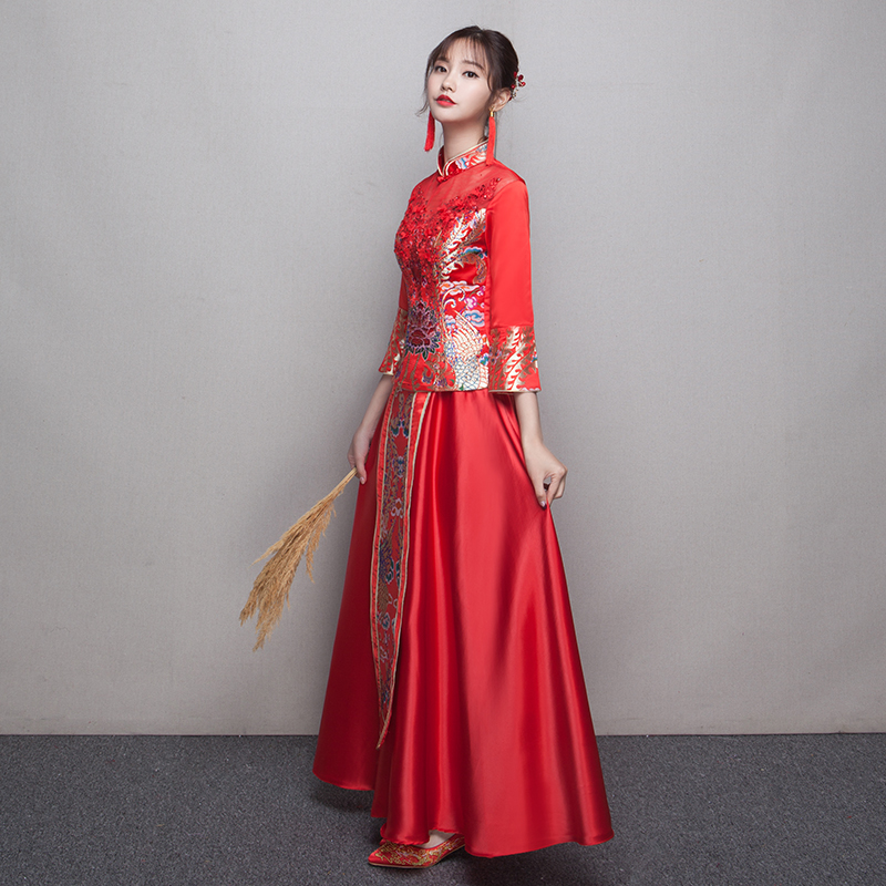 2017新款新娘敬酒服旗袍長款紅色結(jié)婚禮服修身中式秀禾服