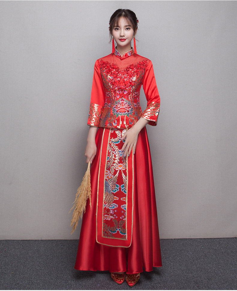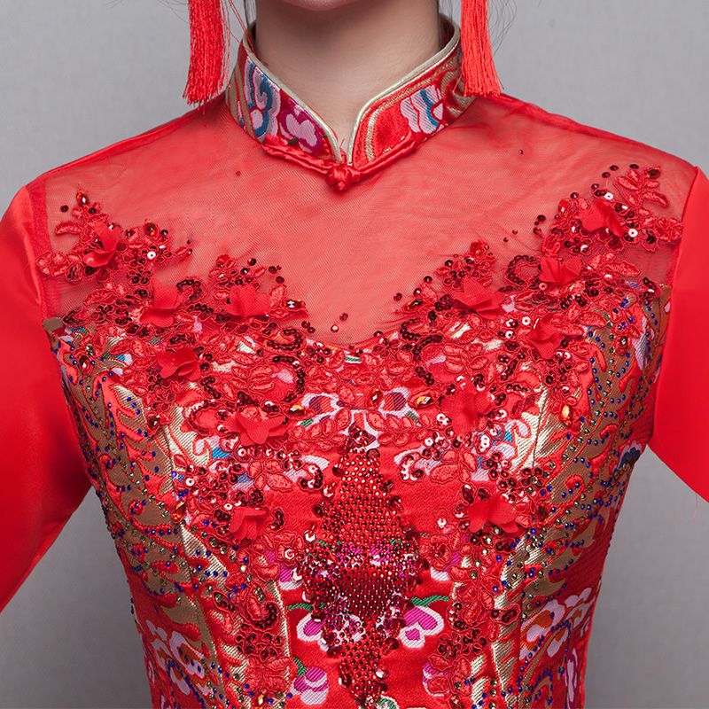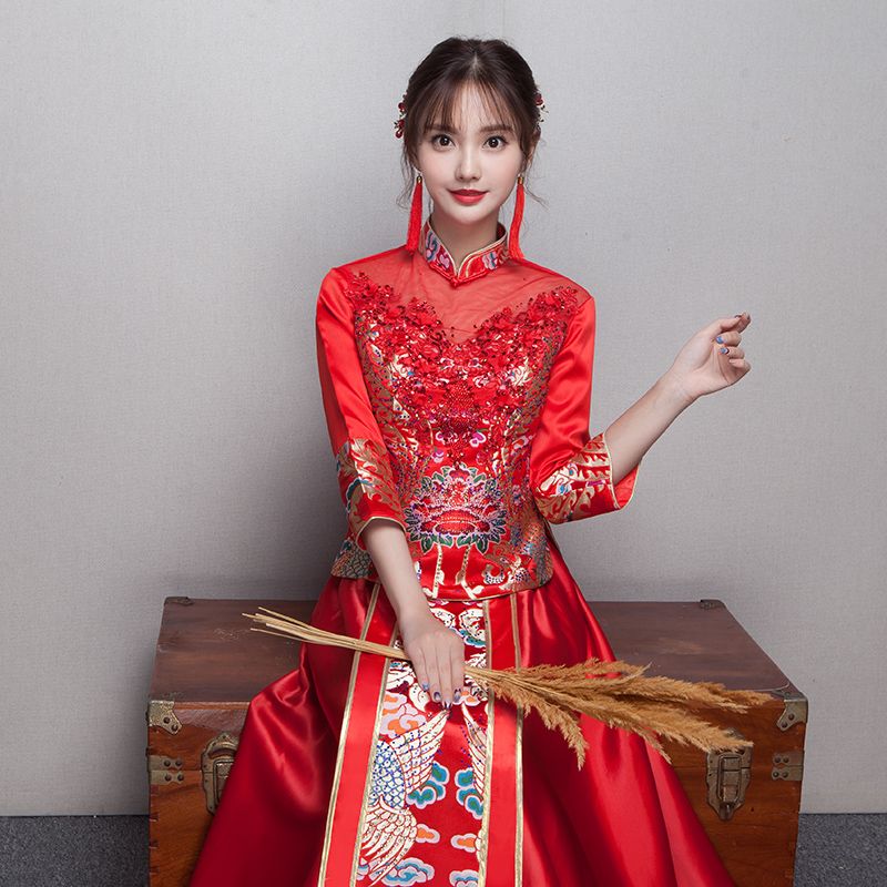 • 送頭飾新款新娘敬酒服旗袍長款紅色結婚禮服修身中式秀禾服夏季