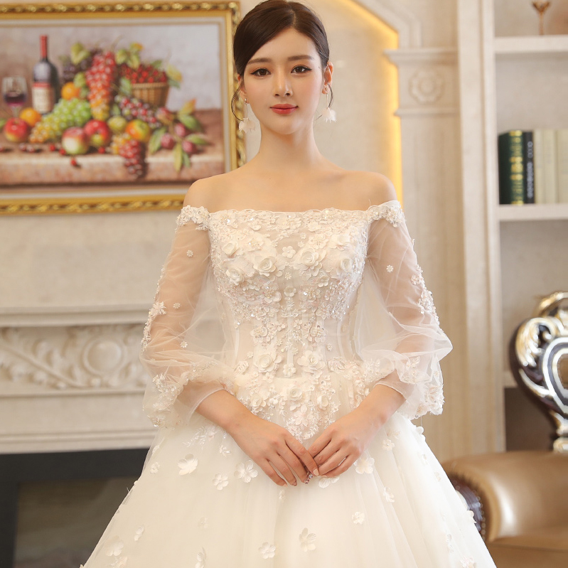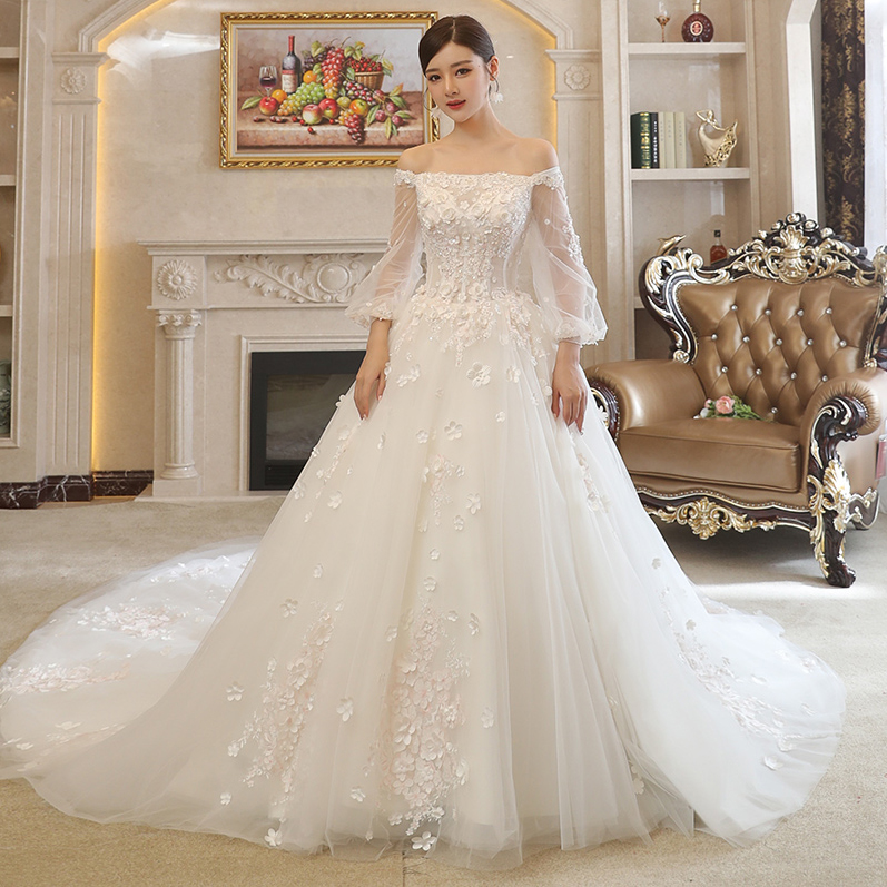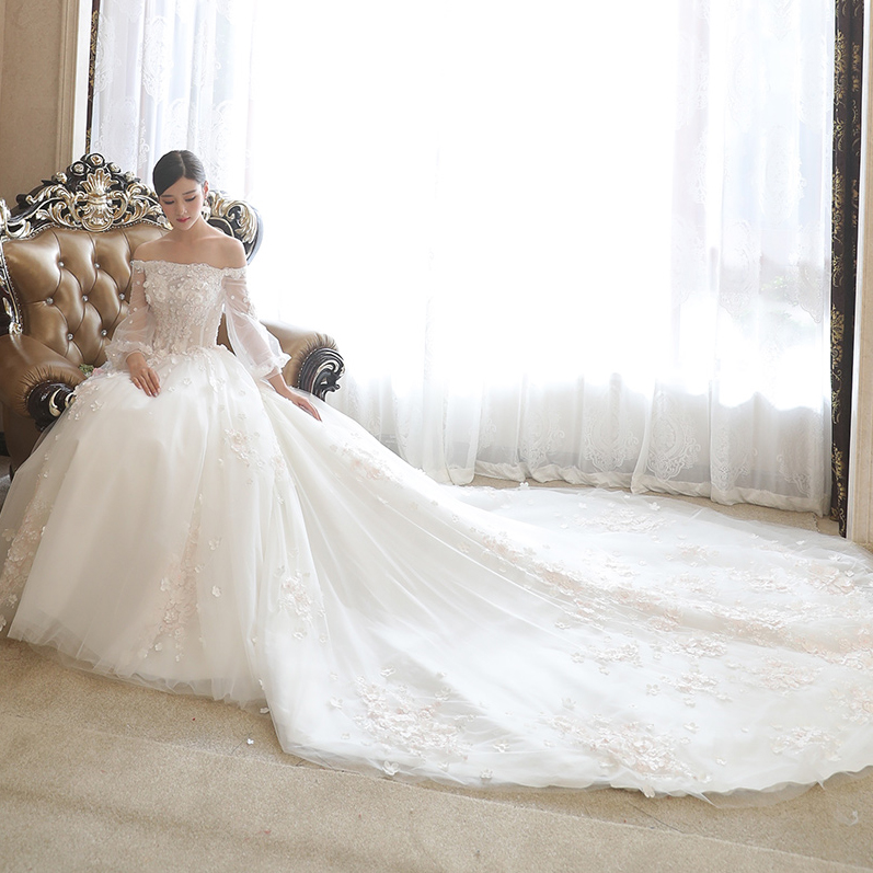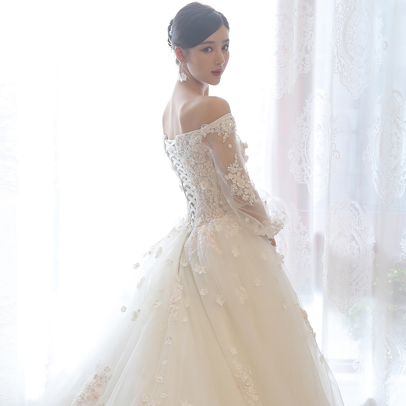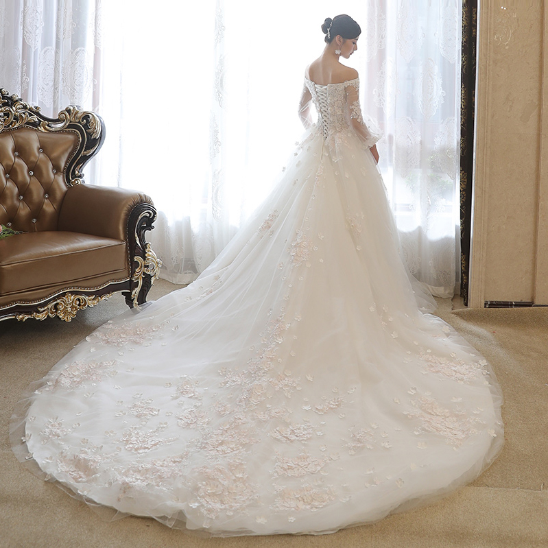 2017新款新娘結(jié)婚一字肩婚紗禮服大長(zhǎng)拖尾