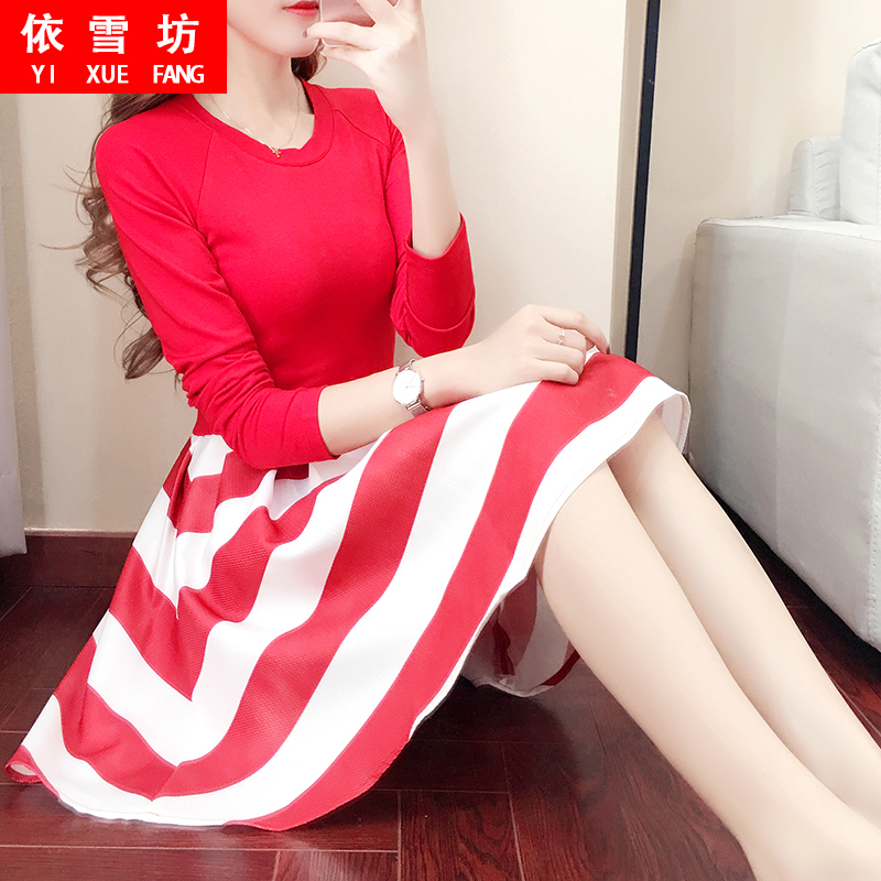 秋款連衣裙2017新款女 韓版時尚正式場合紅白條紋可愛女裝