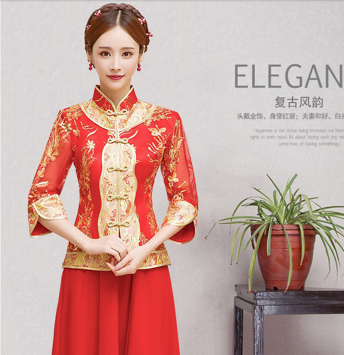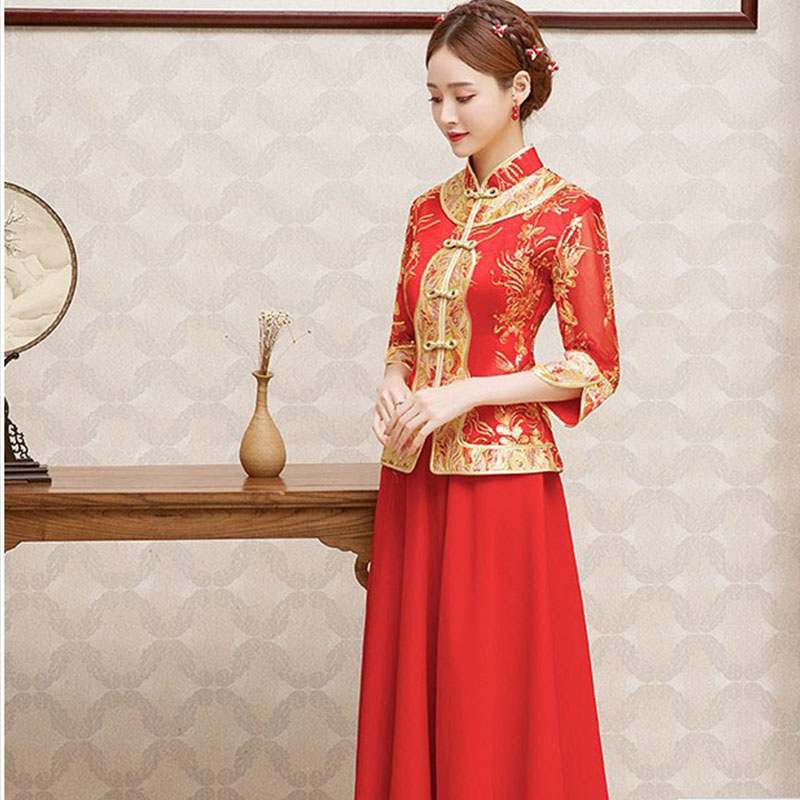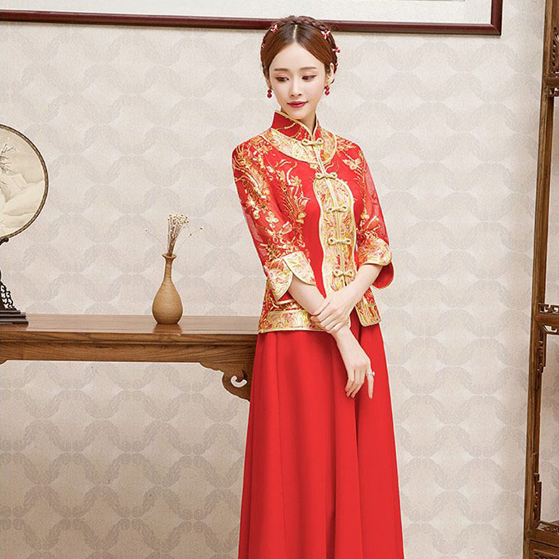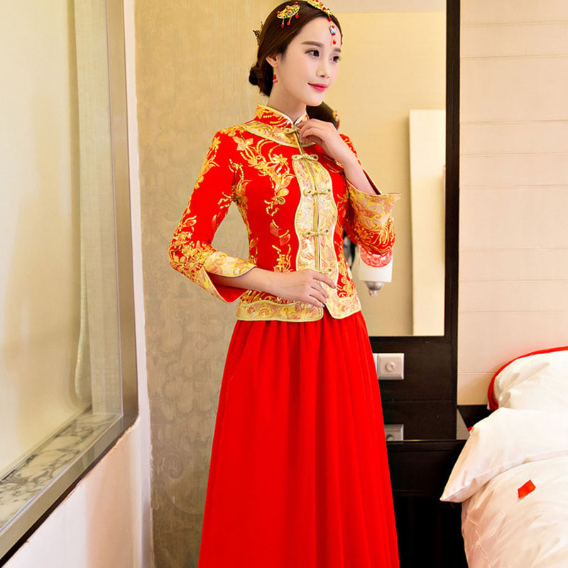 • 新娘敬酒服2017新款中式嫁衣紅色結(jié)婚禮服長旗袍大碼797