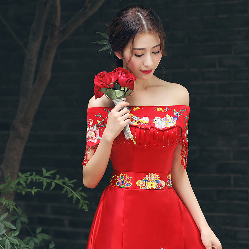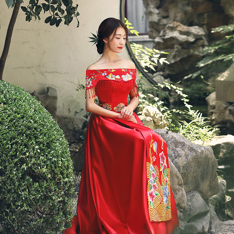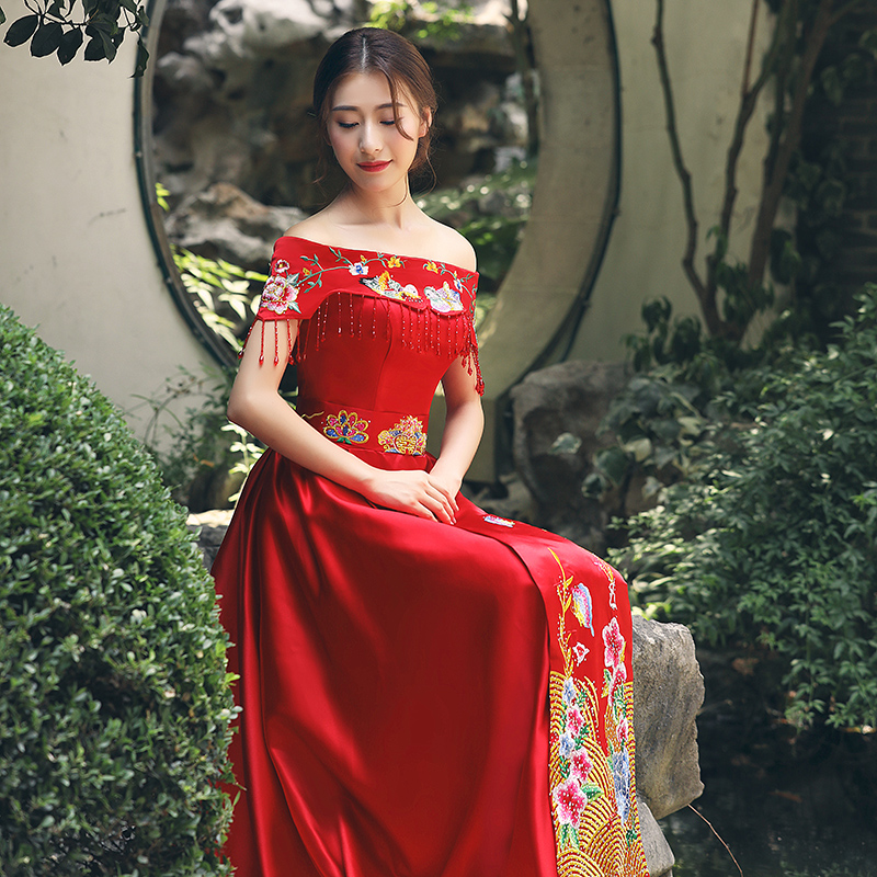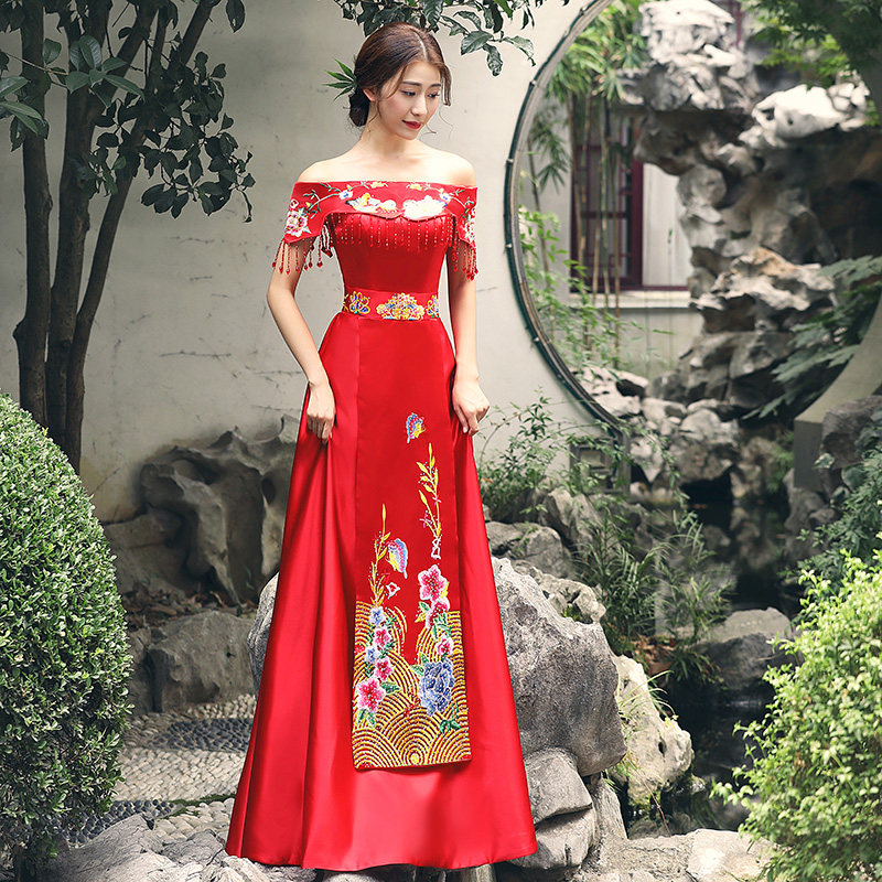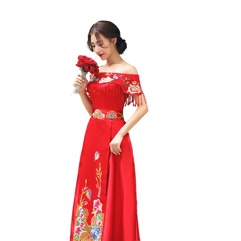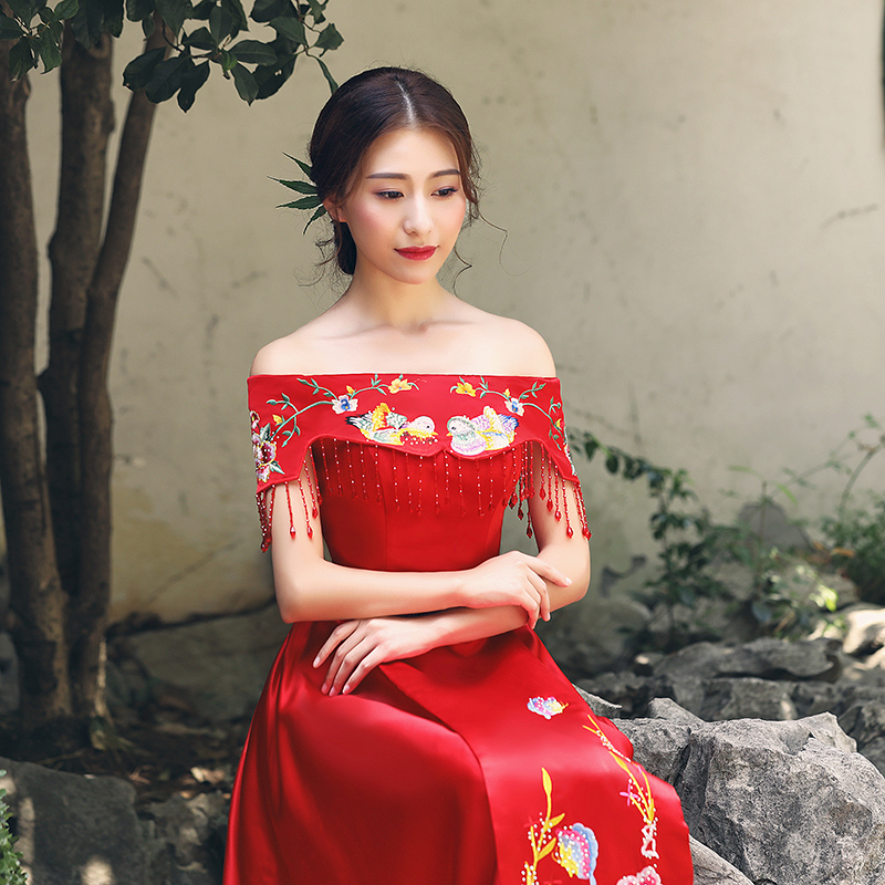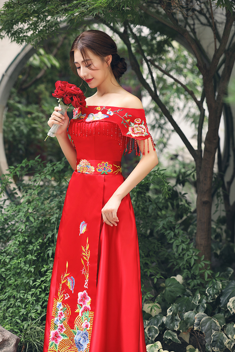 • 中式禮服擠壓一字領(lǐng)束腰串珠流蘇鴛鴦繡花齊地禮服裙