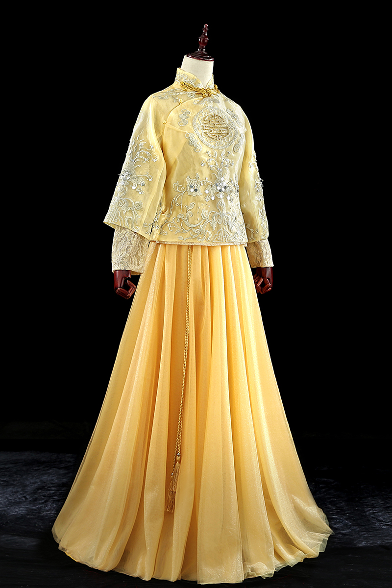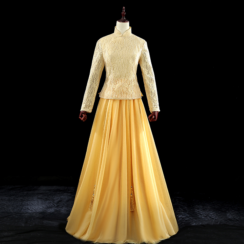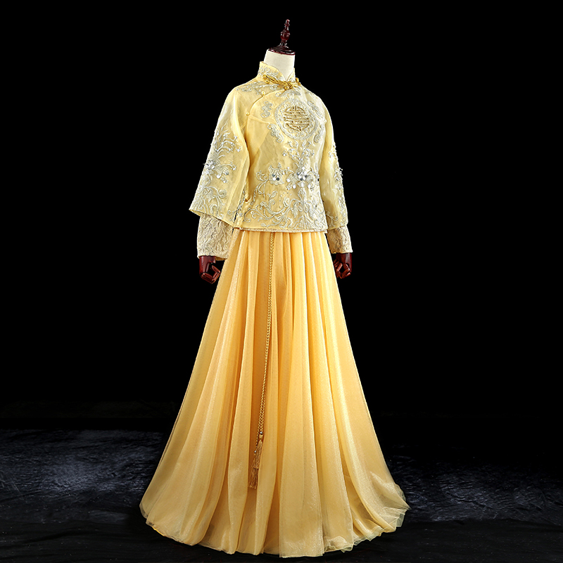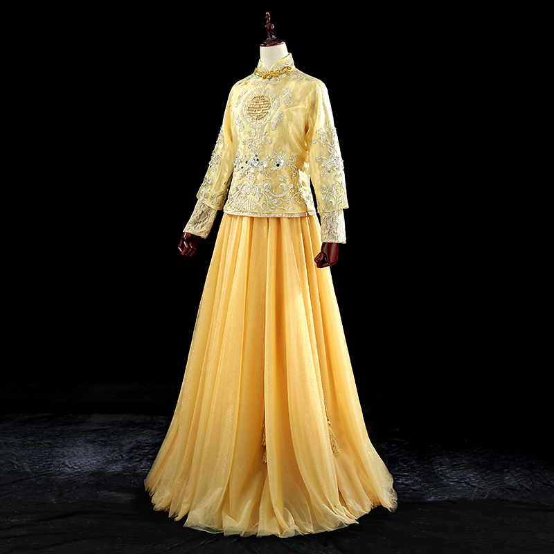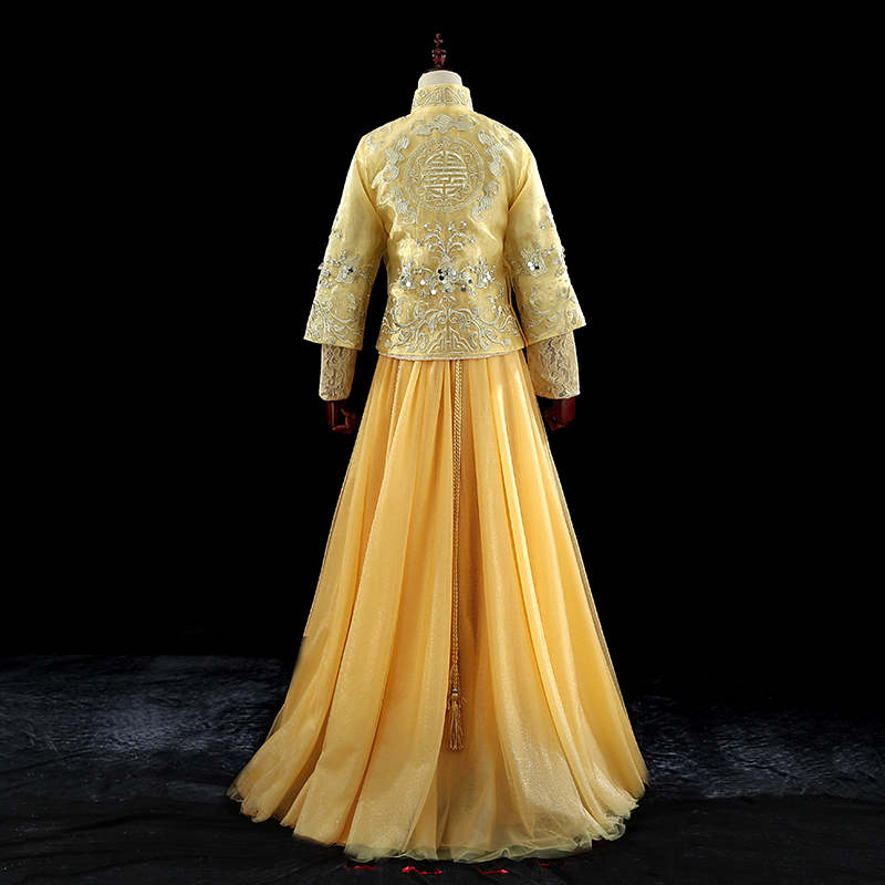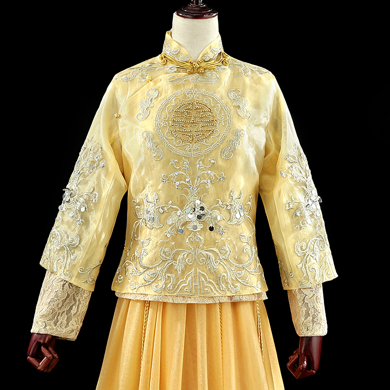 • 2018春金色秀禾服古裝龍鳳褂蕾絲下擺