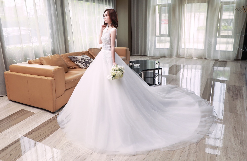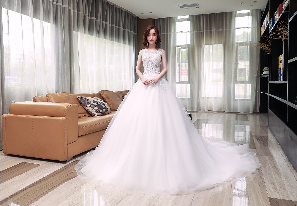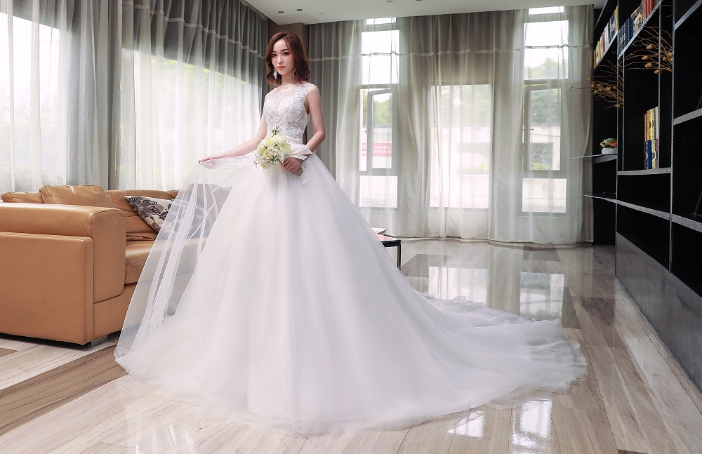 • 2018春季新款拖尾婚紗蕾絲串珠收腰性感微透蓬蓬裙