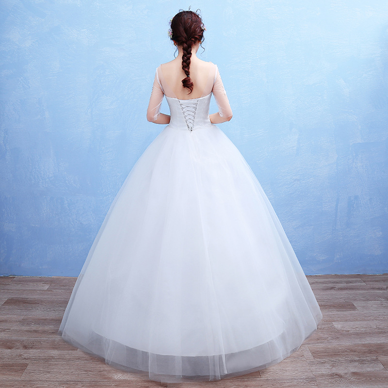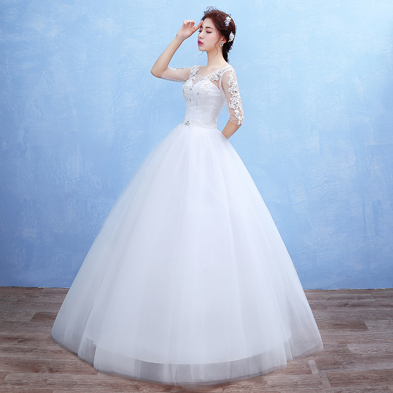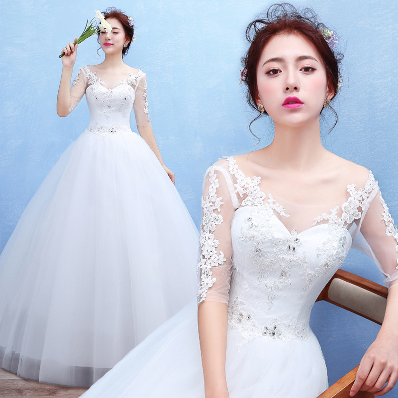 新娘婚紗2017新娘長(zhǎng)袖婚紗禮服韓式一字肩中袖白色婚紗大碼