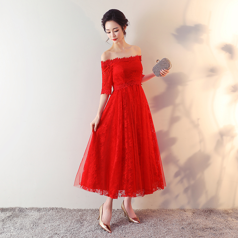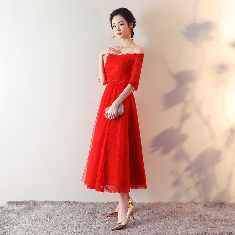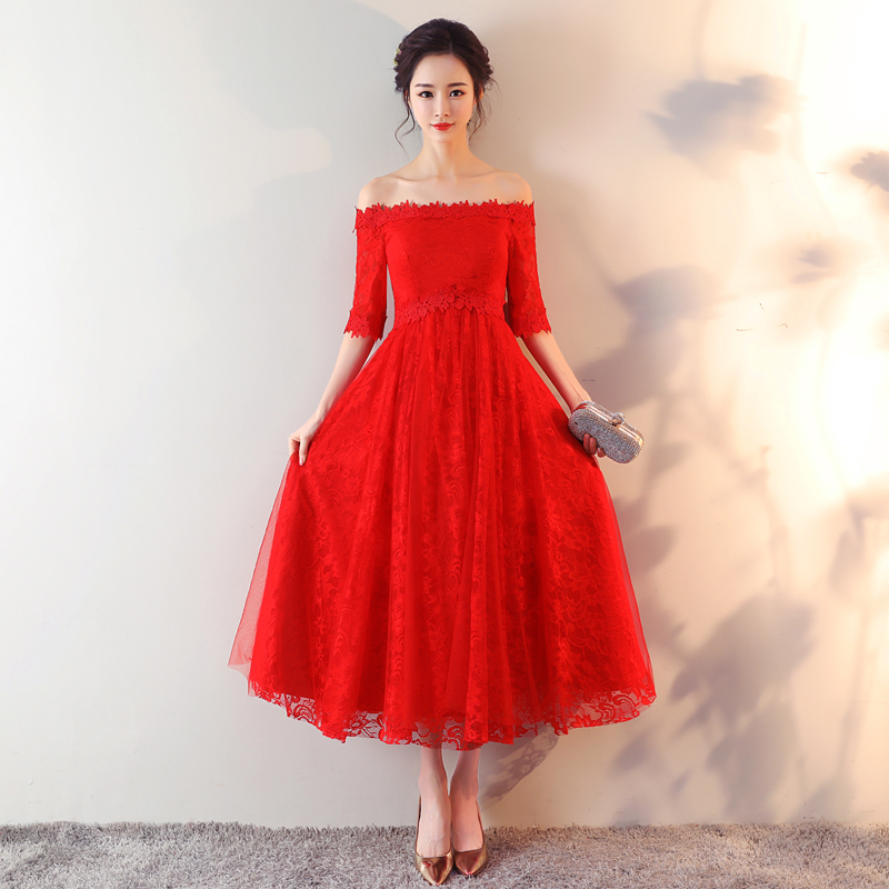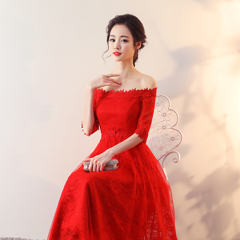 • 孕婦敬酒服新娘2017新款一字肩大碼胖mm高腰紅色結(jié)婚中長款