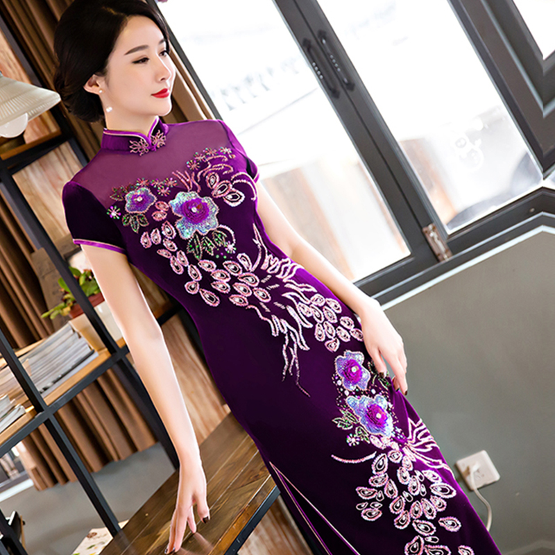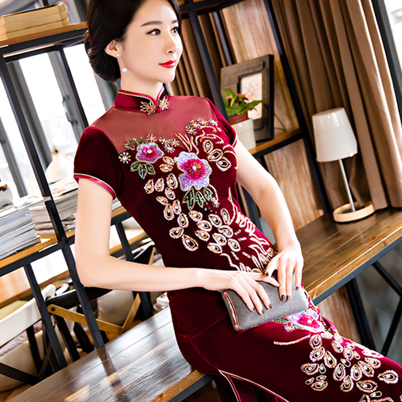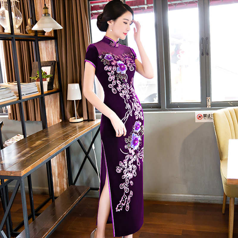 新娘結(jié)婚宴會中老年媽媽裝金絲絨秋裝禮服長款刺繡旗袍裙621