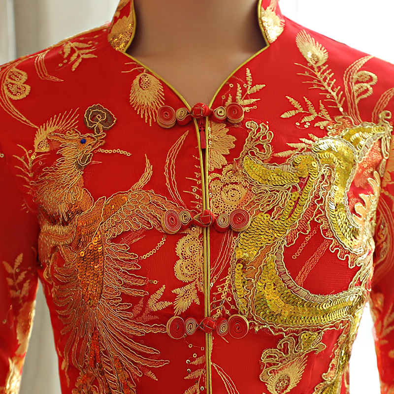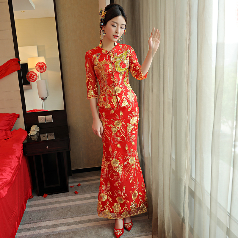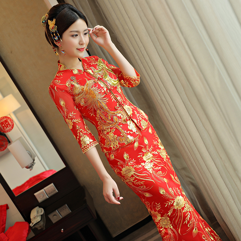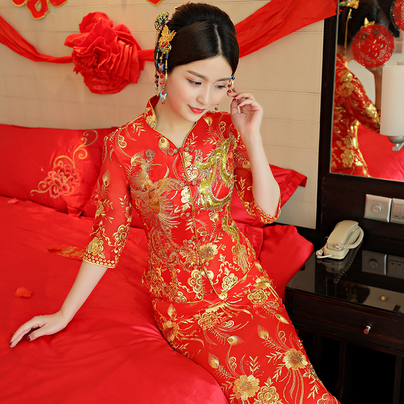 • 秀禾服龍鳳褂2017新款新娘修身旗袍結(jié)婚嫁衣唐裝敬酒服女鳳冠