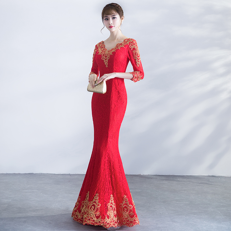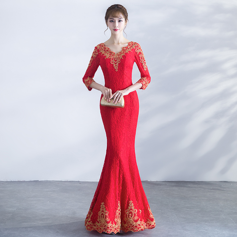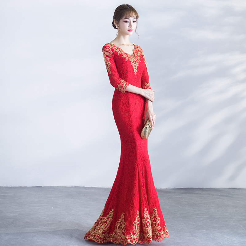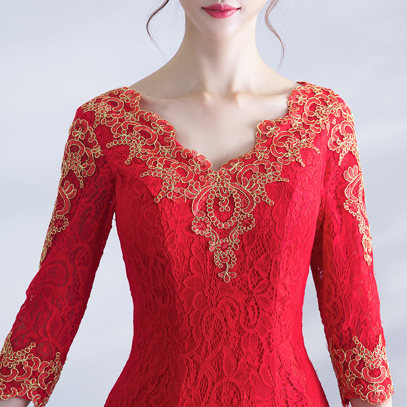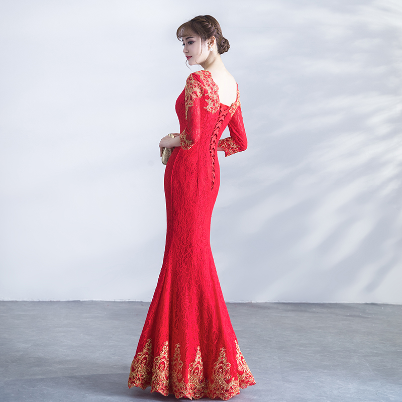 • 敬酒服新娘冬季2017新款韓版紅色長款魚尾修身長袖結(jié)婚禮服女