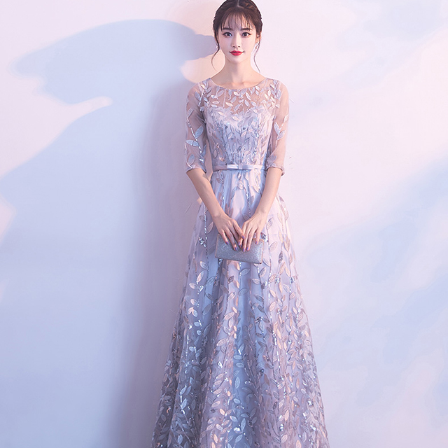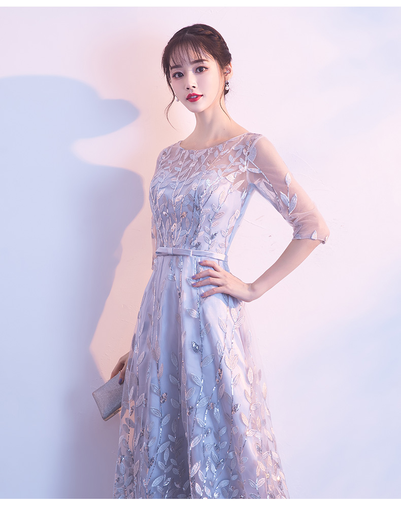 • 韓式銀灰晚禮服裙女長款新款中袖優(yōu)雅宴會年會晚會主持人伴娘公主