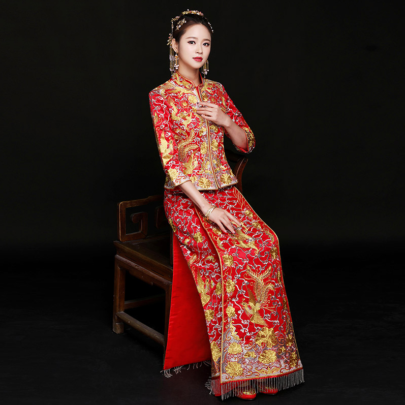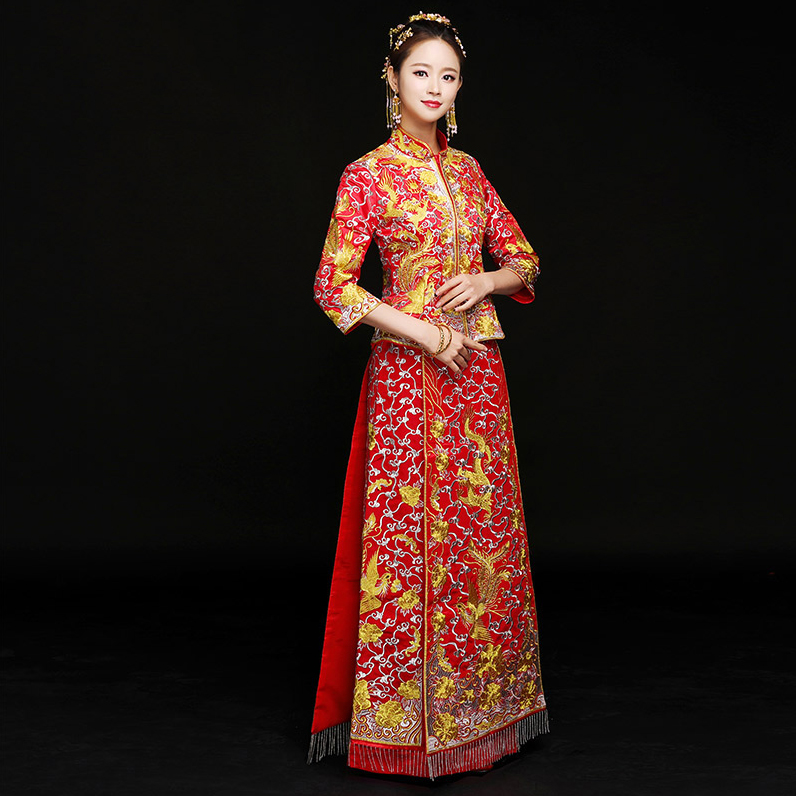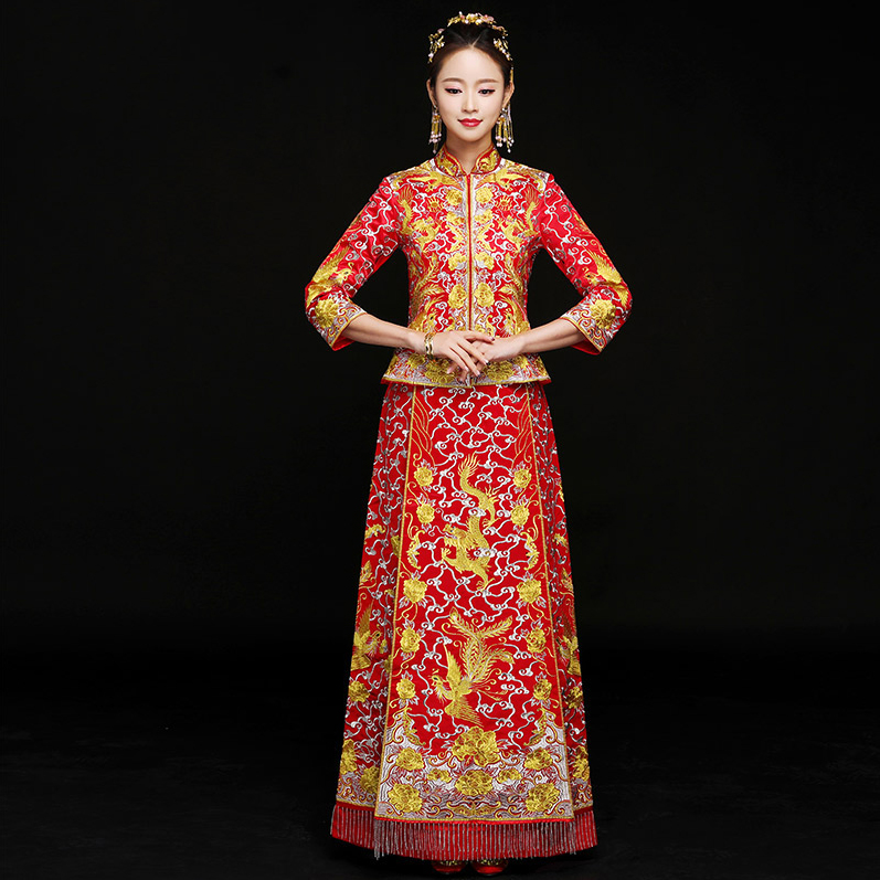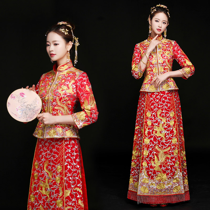 • 傳統(tǒng)龍鳳祥服!2017新款婚紗旗袍冬婚禮禮服敬酒服新娘中式
