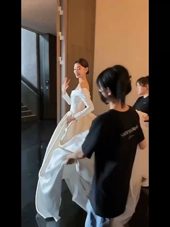 緞面一字肩長(zhǎng)袖主紗