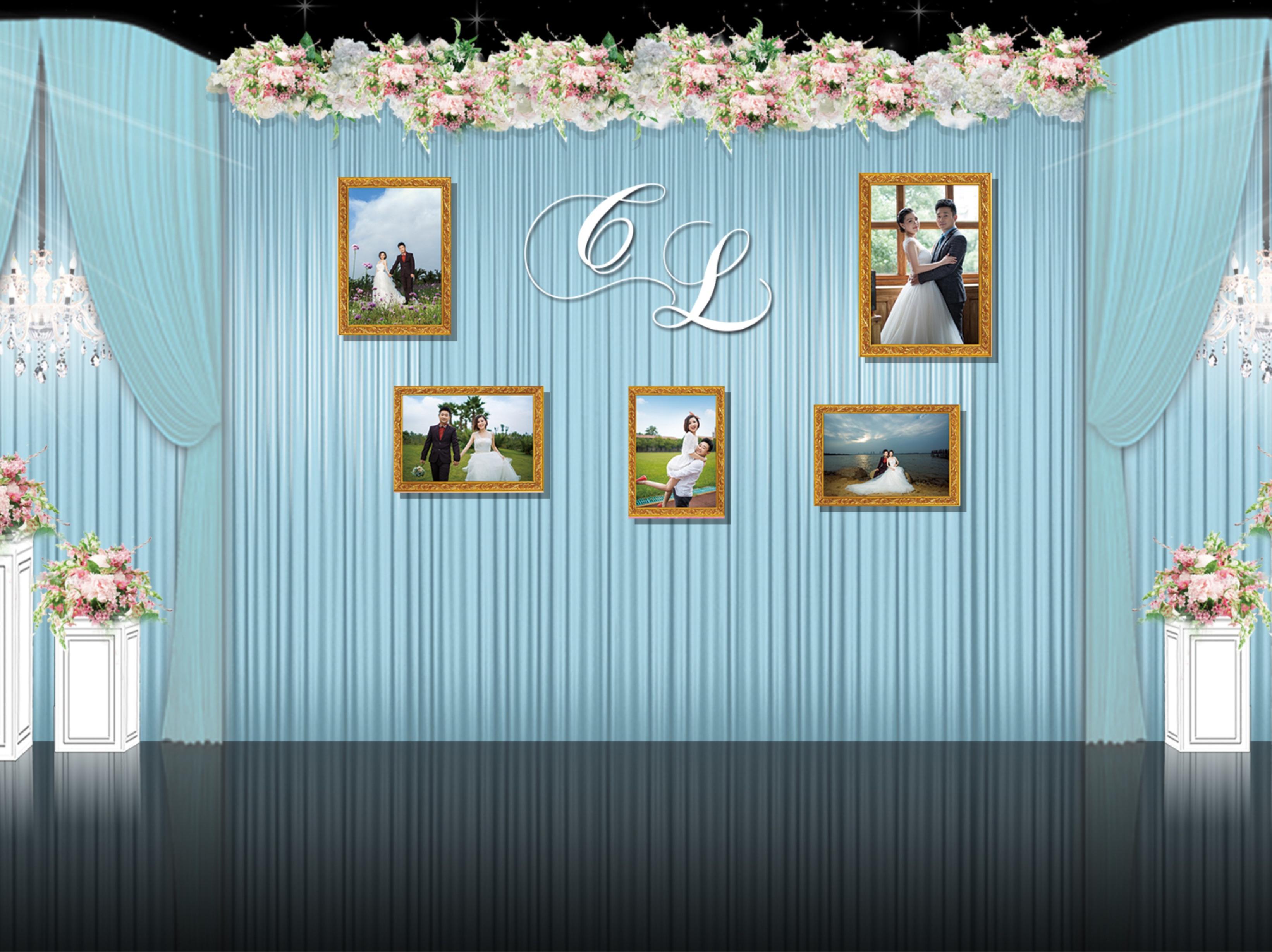 1.展示區(qū)背景搭建+藍(lán)色布幔裝飾+水晶吊燈1組+花藝+新人相片+新人LOGO+白色羅馬柱花藝,大小為1組,共2組